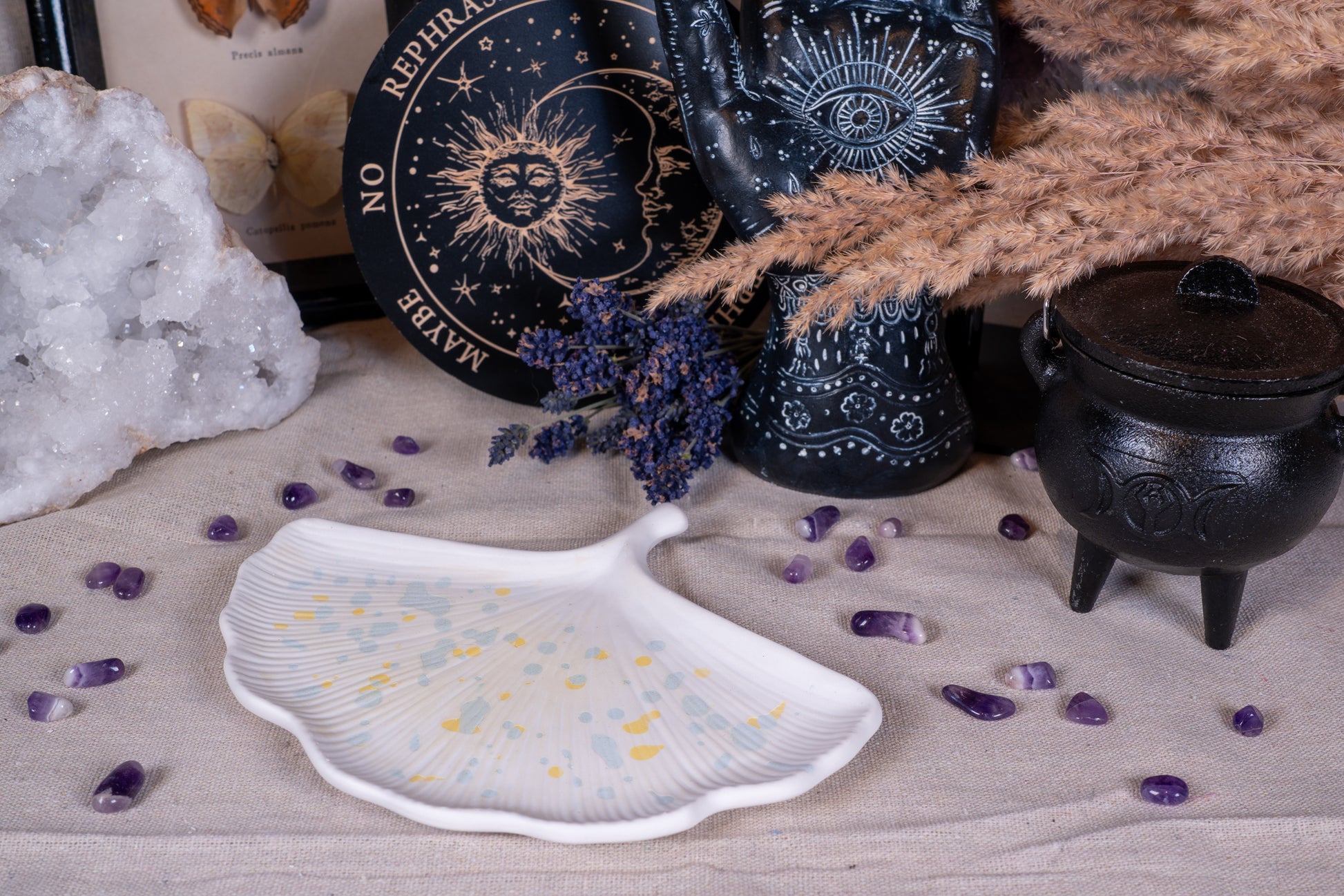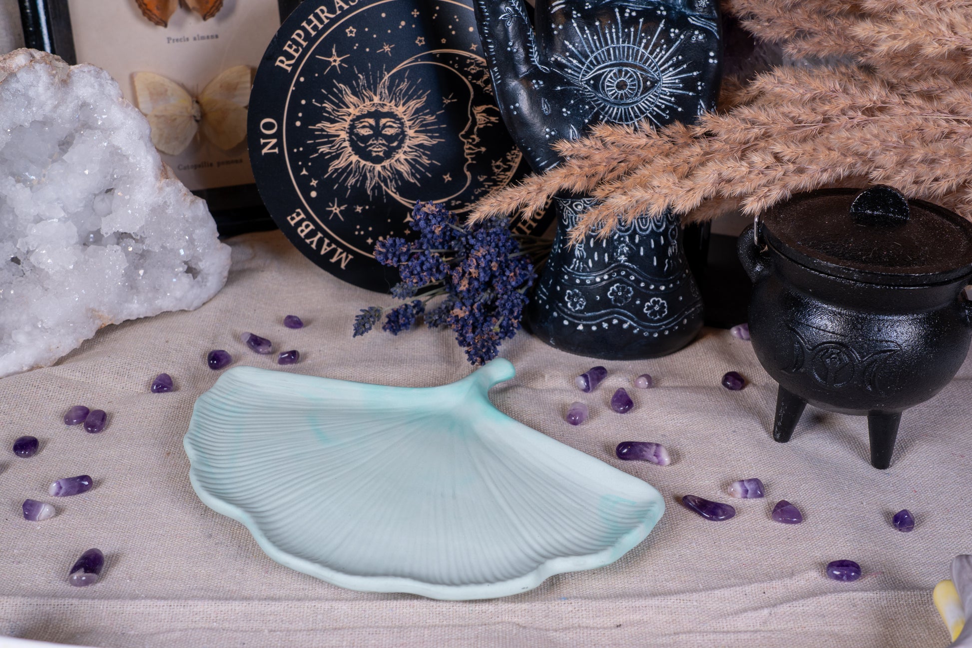 Zart, naturverbunden und voller symbolischer Kraft – Danu ist eine liebevoll geformte Keramikschale, inspiriert vom Ginkgoblatt, das für Beständigkeit, Heilung und die Weisheit des Wandels steht. Die organische Form und das sanfte Farbspiel machen sie zu einem magischen Begleiter für deinen Altar, deinen Nachttisch oder als kleines Aufbewahrungswunder im Alltag.