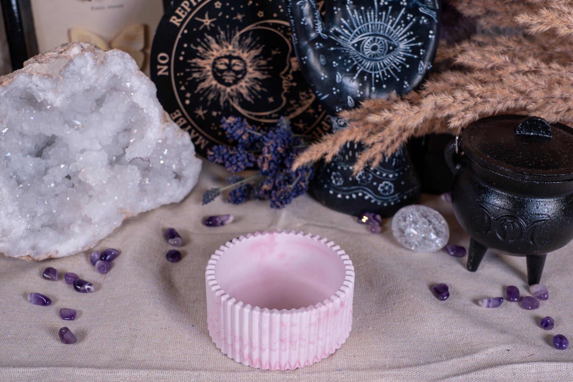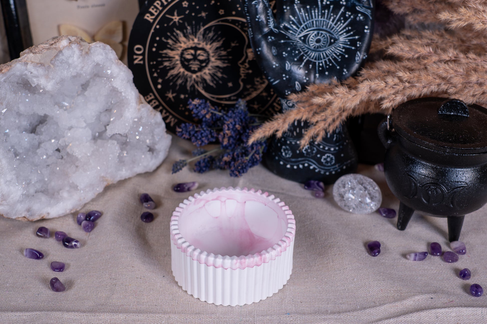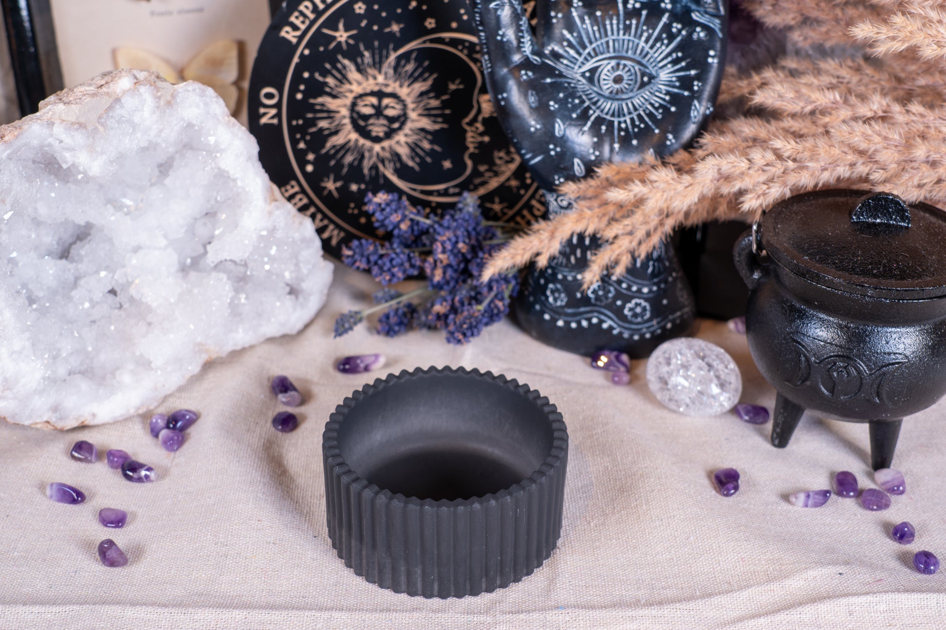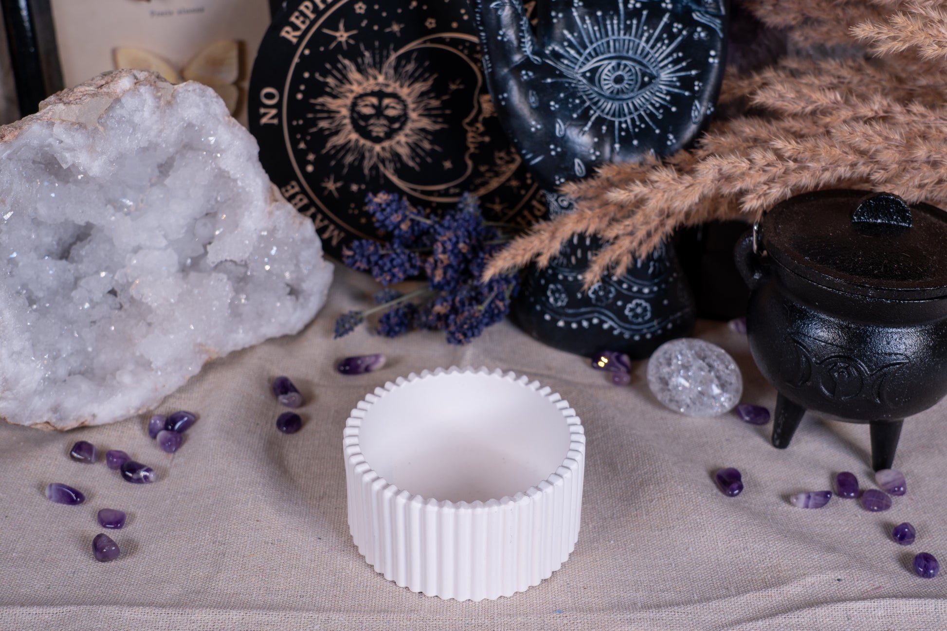 Diese elegante Schale aus unglasierter Keramik ist ein stiller Begleiter für deine spirituelle Praxis – schlicht im Design, aber voller Ausstrahlung. Mit ihrer fein geriffelten Oberfläche fügt sie sich harmonisch in jede Altar-, Ritual- oder Dekoumgebung ein.