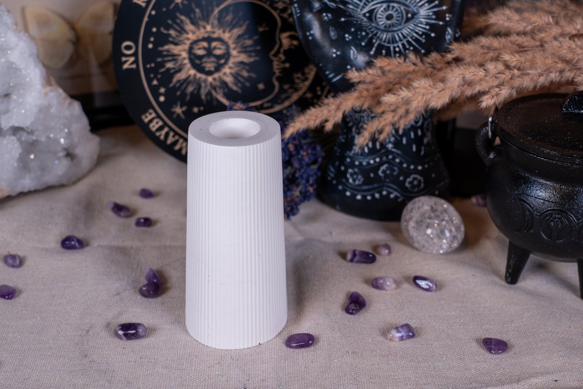 Mit seiner eleganten, vertikal gerillten Struktur und der ruhigen, hellen Oberfläche wirkt Dike wie eine aufgerichtete Säule der Klarheit. Der Kerzenhalter bringt durch seine Form eine kraftvolle, aufrichtende Energie in deinen Raum – minimalistisch und dennoch präsent.