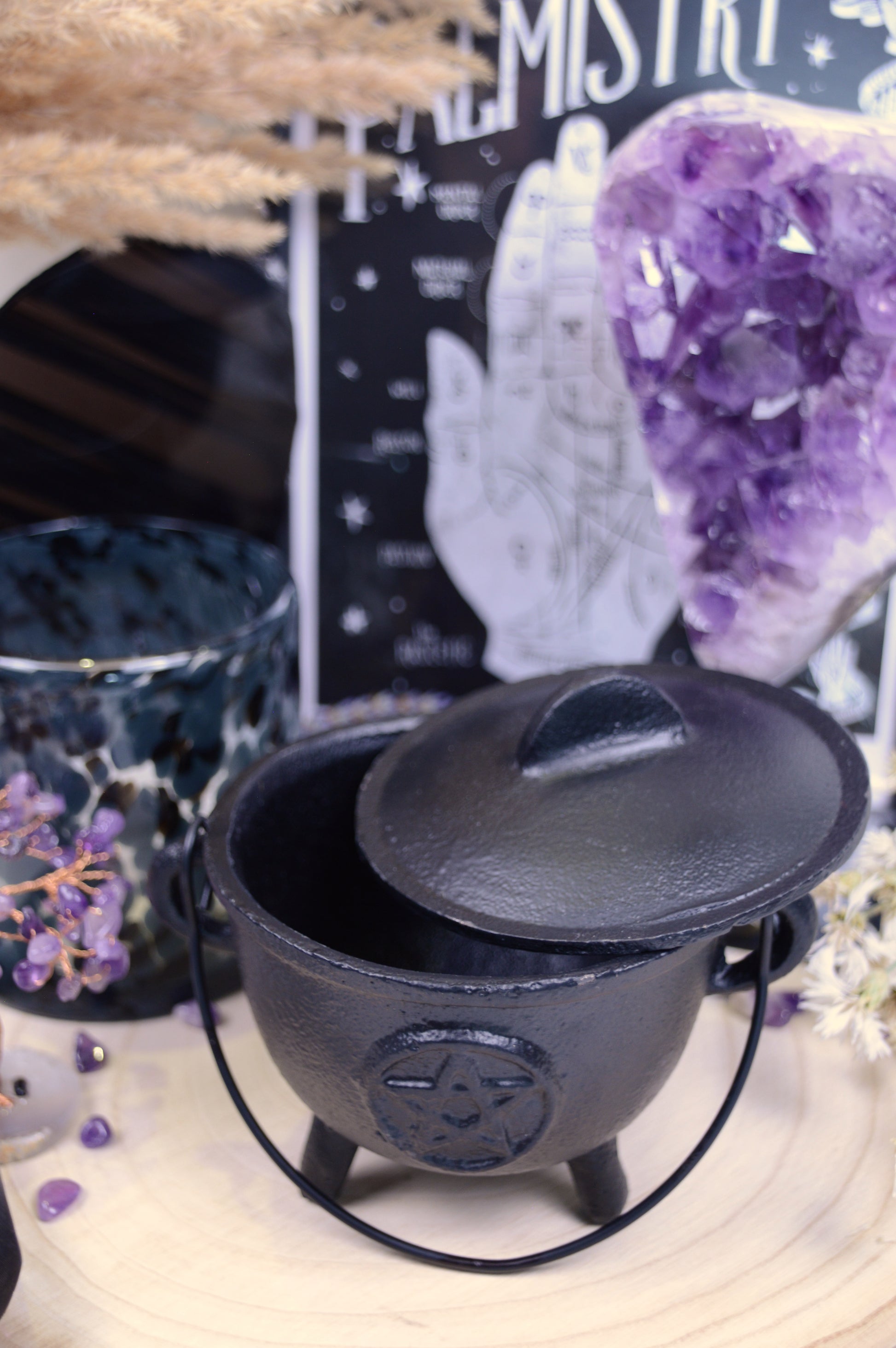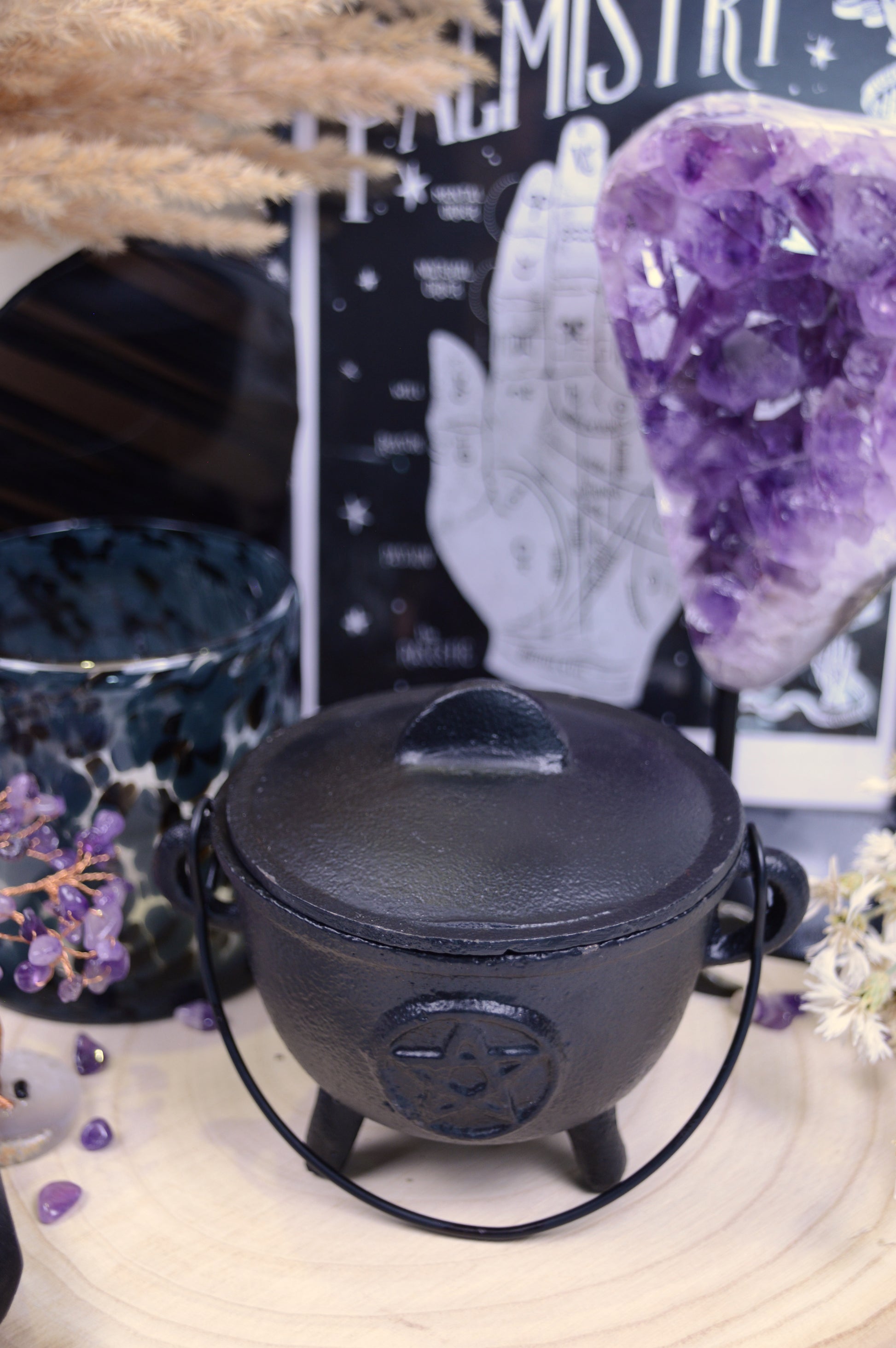 Ein kraftvoller Gusseisenkessel in stabiler Ausführung, geschmückt mit einem Pentagramm – dem uralten Symbol für Schutz, Magie und die Einheit der Elemente. Mit seiner tieferen Schale bietet er viel Raum für Rituale und ist ideal für alle, die etwas mehr Platz für ihre magische Arbeit benötigen.