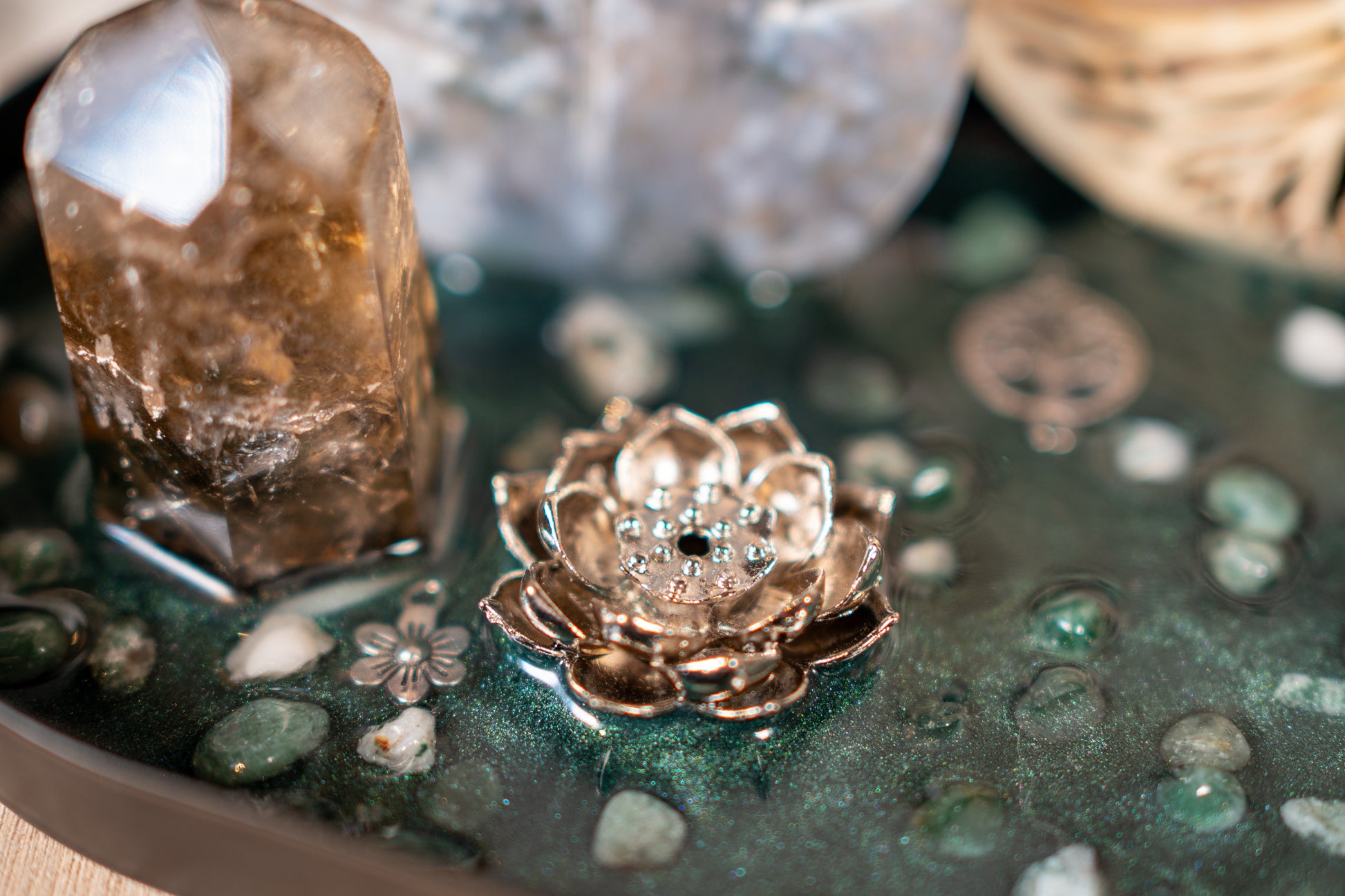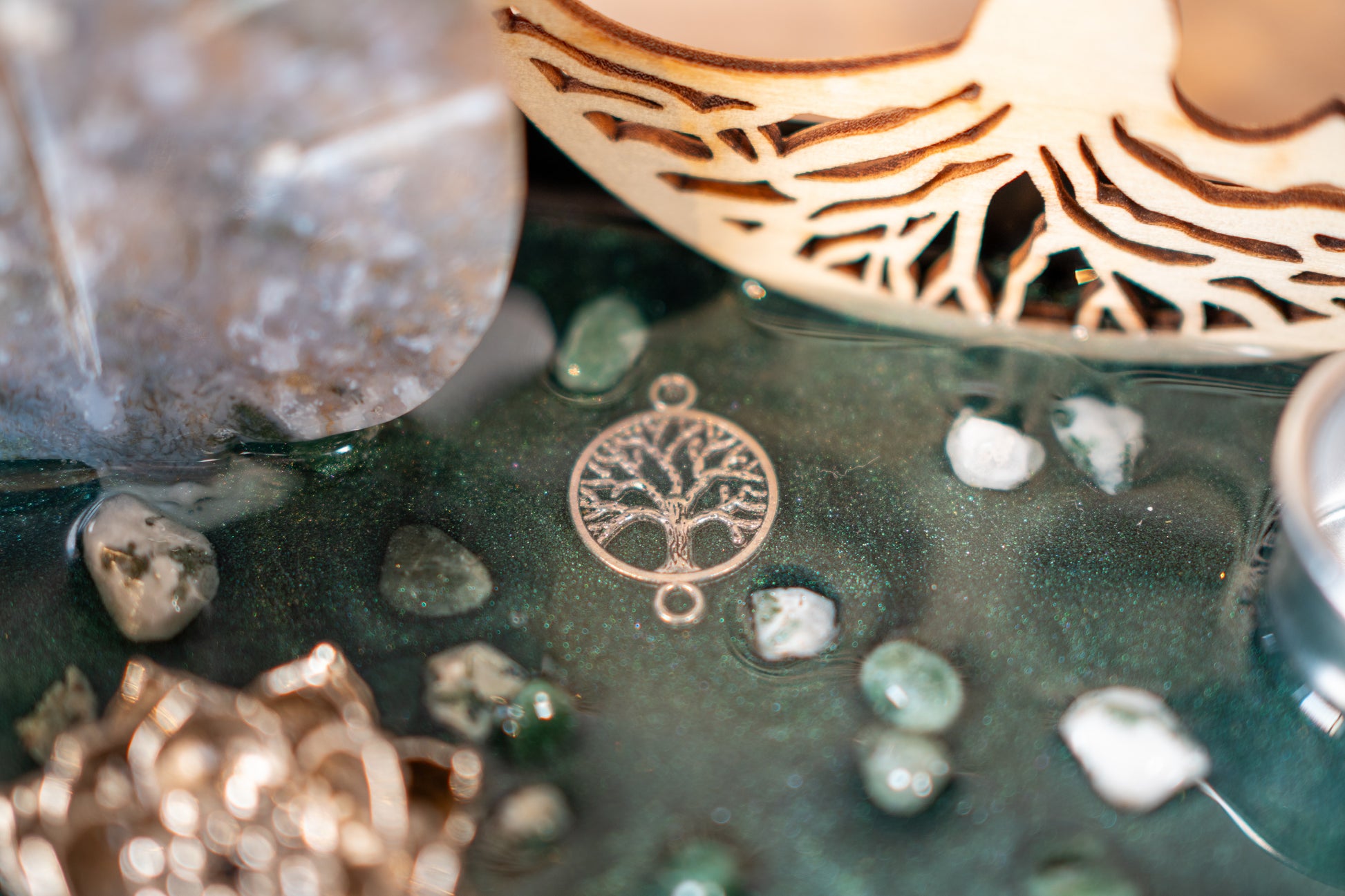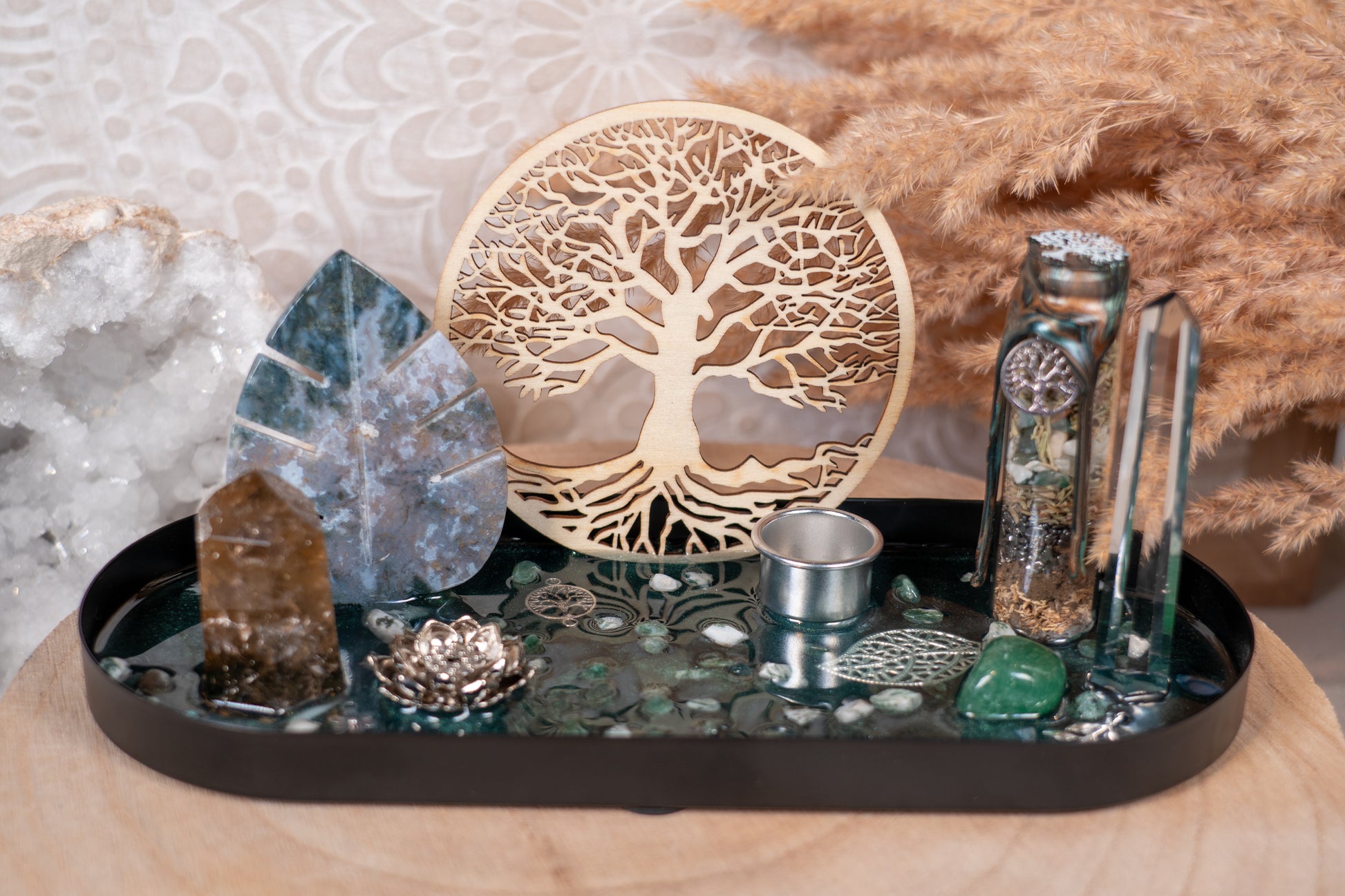 • Das Tablett dient der Dekoration und energetischen Arbeit – die Objekte sind fest eingegossen