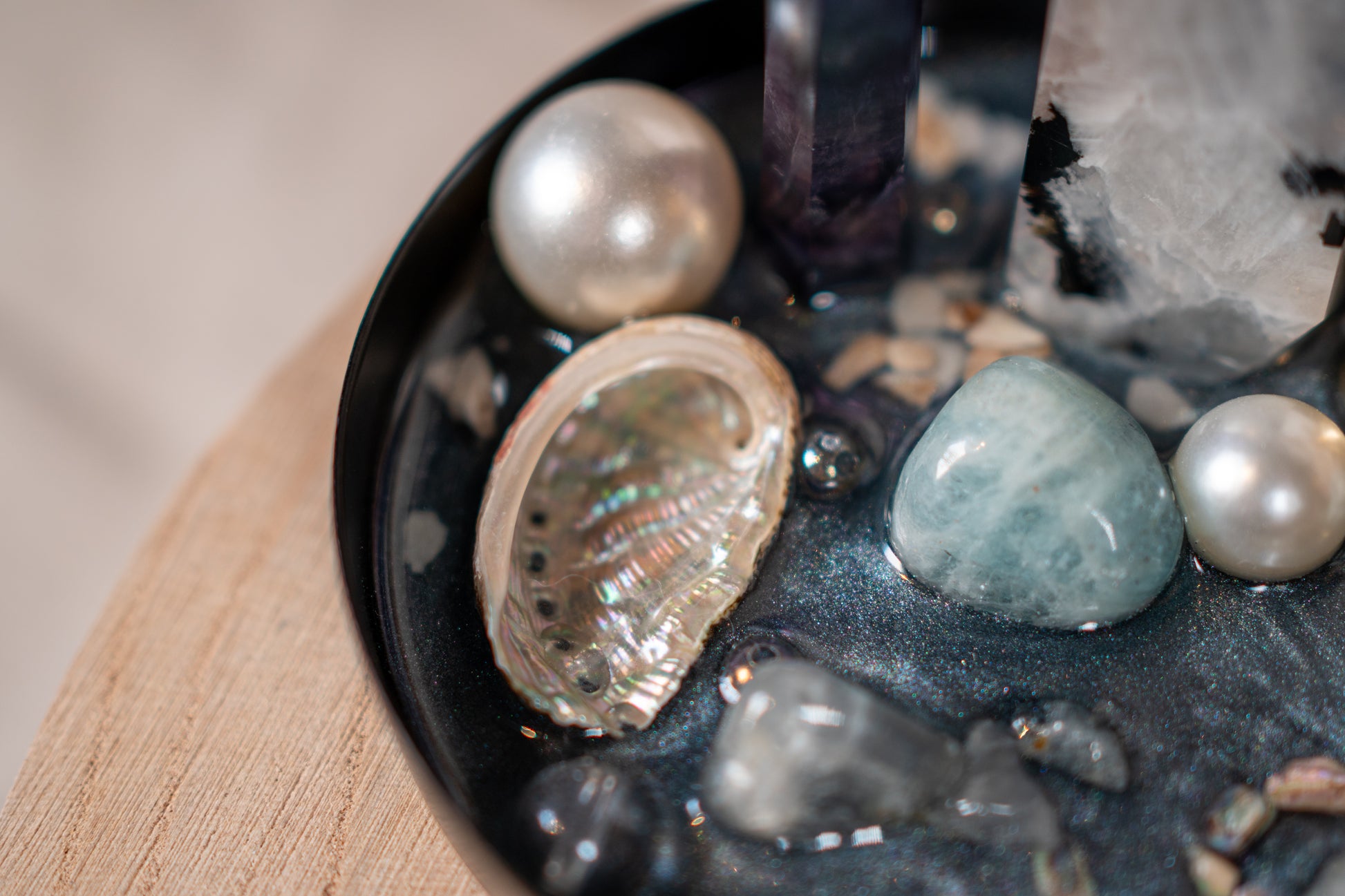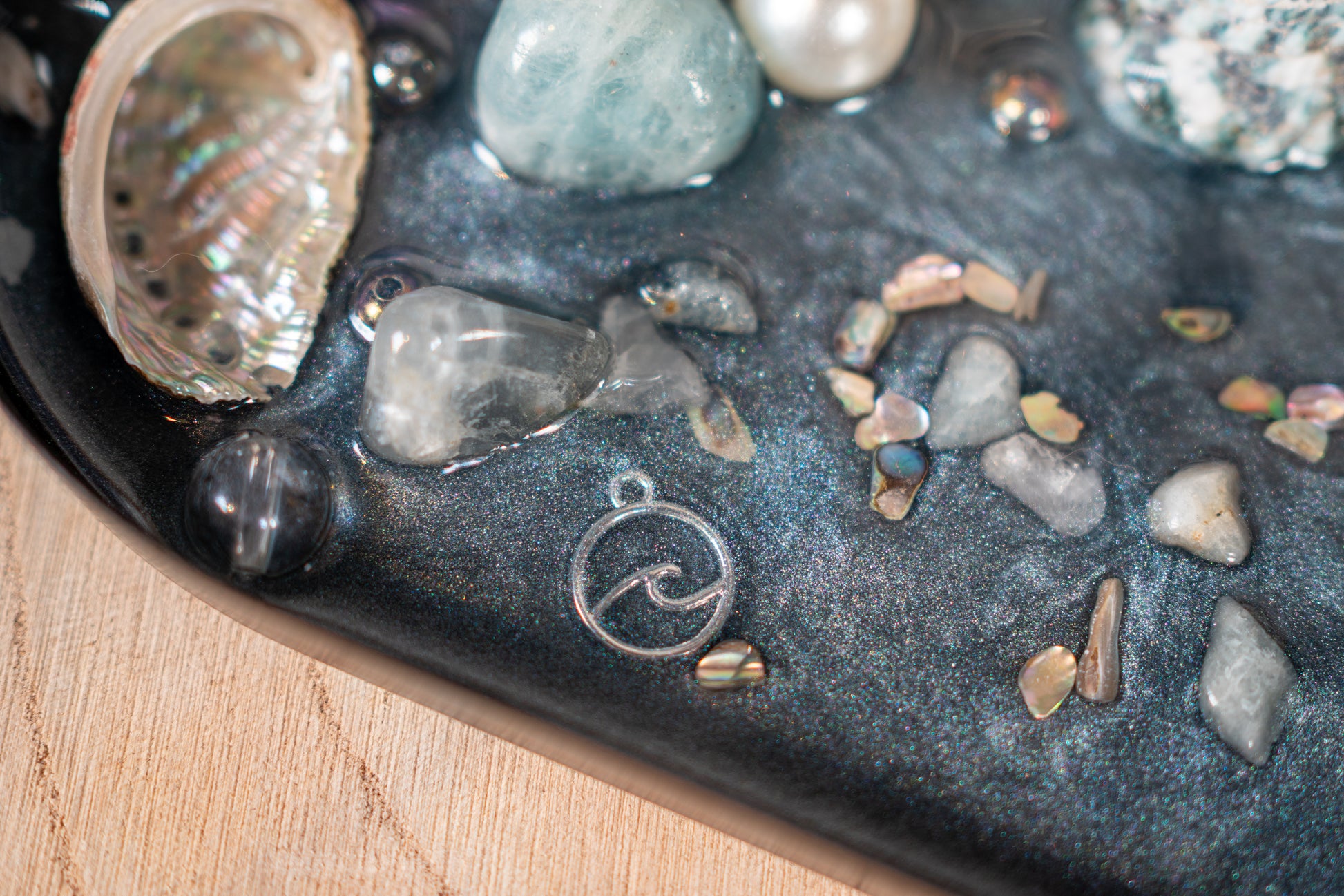 Eine kleine, silberne Muschelschale, Abalone-Splitter und schimmernde Perlenelemente erinnern an den Zauber des Ozeans – ergänzt durch einen abnehmbaren Perlenkugel-Element als liebevolles Detail für Rituale oder als Wunschträger.