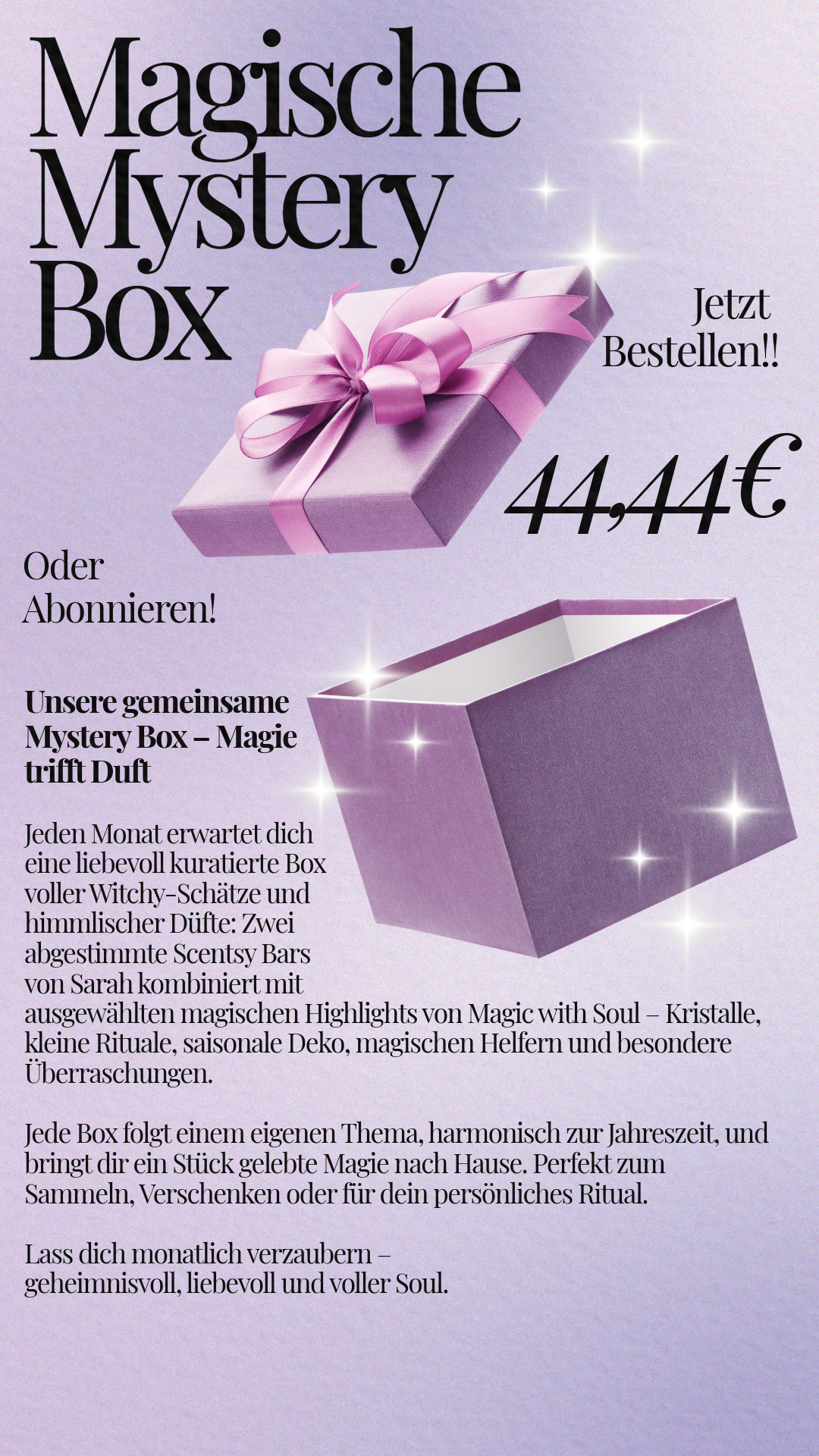 Tauche Monat für Monat in eine Welt voller Magie, Düfte und liebevoll ausgewählter Überraschungen ein. Unsere Magische Mystery Box entsteht in Zusammenarbeit von Magic with Soul und Sarah Baumbach (Scentsy-Beraterin) und verbindet hochwertige Duftkreationen mit witchy Schätzen, kleinen Ritualen und magischen Begleitern für deinen Alltag. Jede Box steht unter einem neuen, saisonal passenden Thema, bleibt aber immer harmonisch aufgebaut und eignet sich perfekt zum Sammeln, Verschenken oder für deine persönliche spirituelle Praxis.