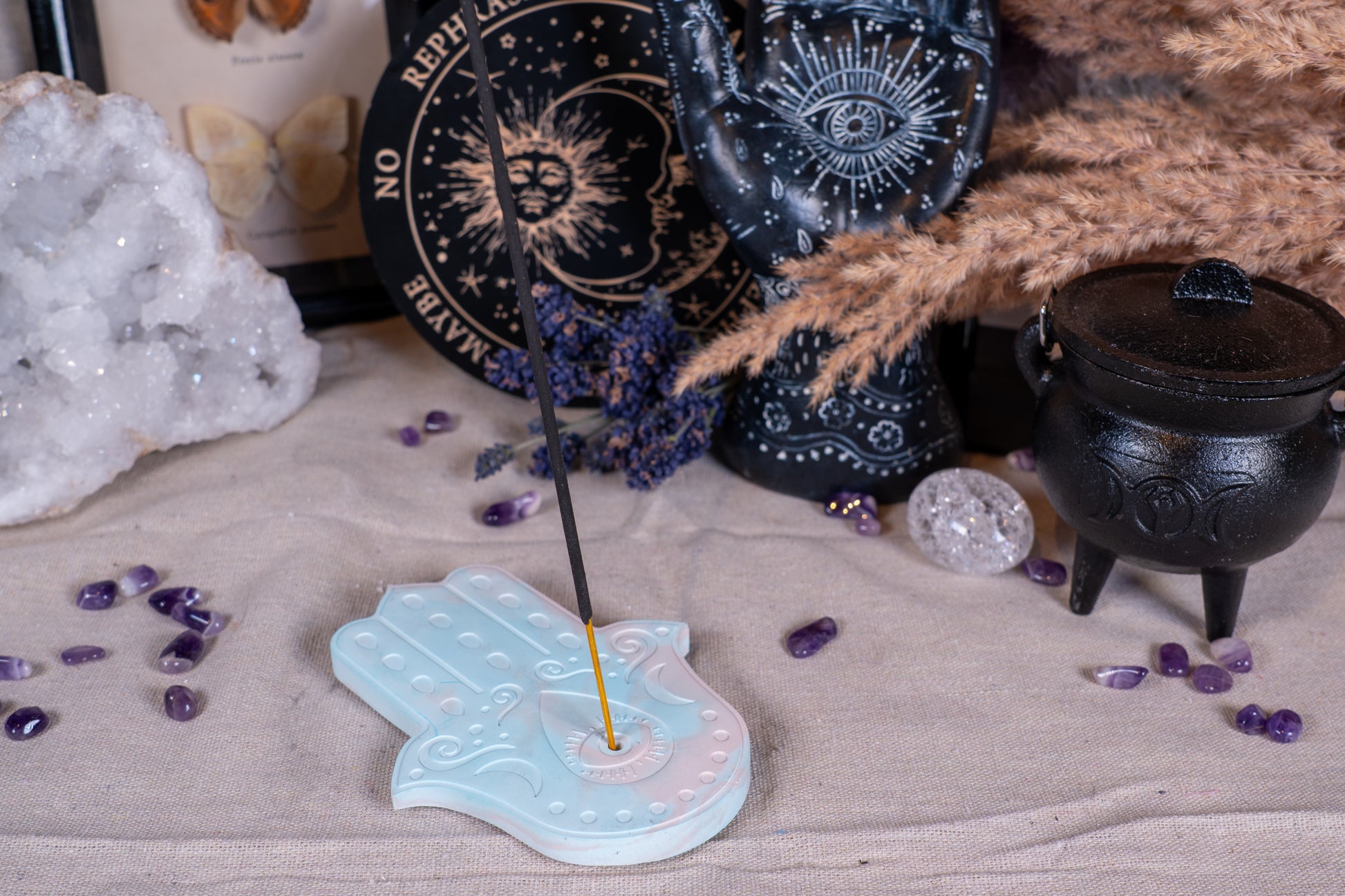 Ein Symbol für Schutz, Wandlung und spirituelle Klarheit. Der Räucherstäbchenhalter Kali trägt die kraftvolle Hamsa-Hand mit dem allsehenden Auge – ein uraltes Zeichen zur Abwehr negativer Energien. Benannt nach der indischen Göttin der Transformation, lädt er dich ein, Altes loszulassen und dich neu auszurichten. Das zarte Hellblau wirkt beruhigend, lichtvoll und lässt sich wunderbar in jedes Ritual integrieren. Ob zur energetischen Reinigung, für deine Meditation oder einfach, um dir einen Moment der Stille zu schenken – Kali begleitet dich als beschützende Kraft auf deinem Weg.