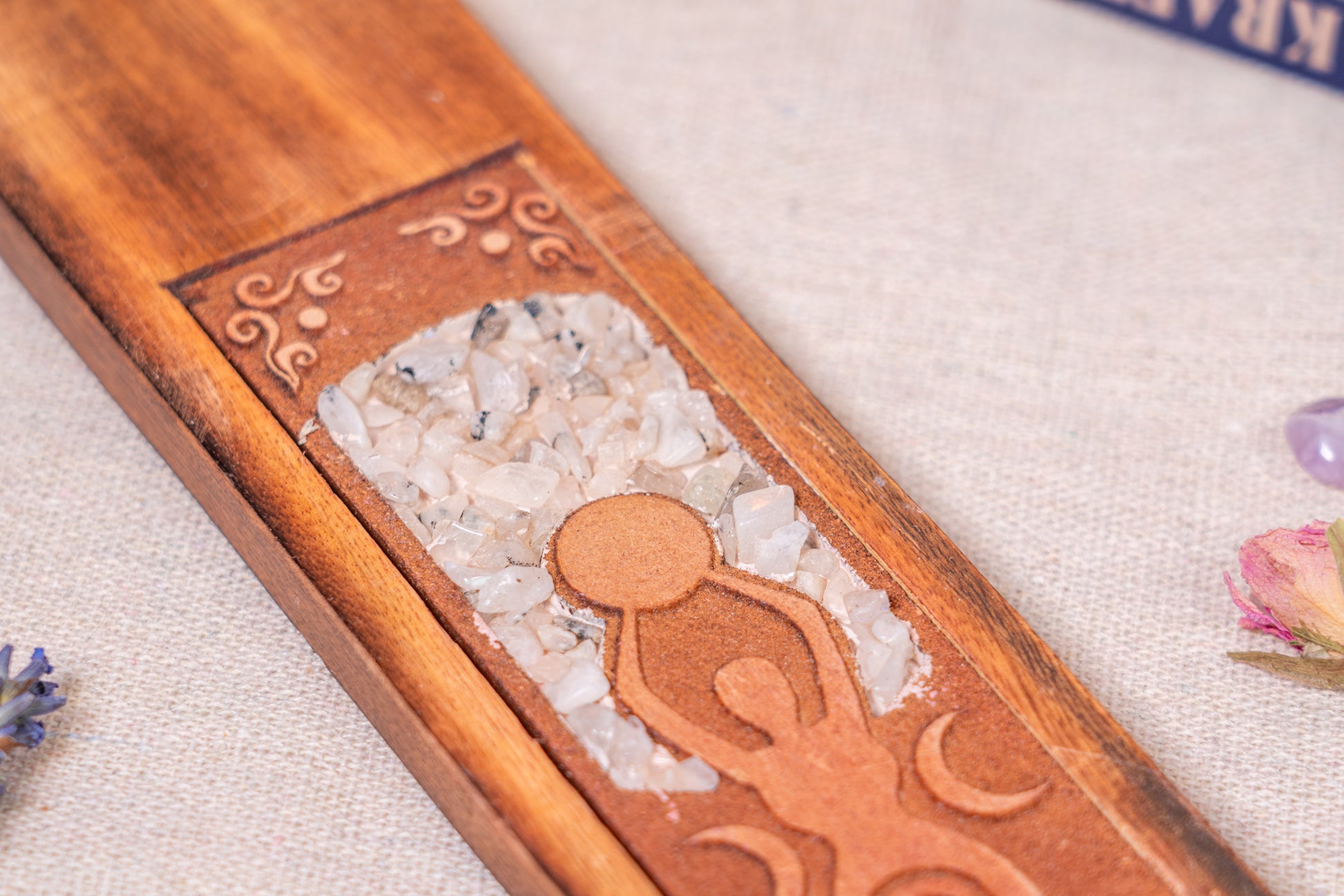 Dieser besondere Halter zeigt die anmutige Mondgöttin, gefertigt aus schimmerndem Mondstein. Der Stein steht für Intuition, Weiblichkeit und den Zyklus des Lebens. Platziere dein Räucherstäbchen und lasse den feinen Rauch emporsteigen, als Botschaft an die Mondgöttin selbst.