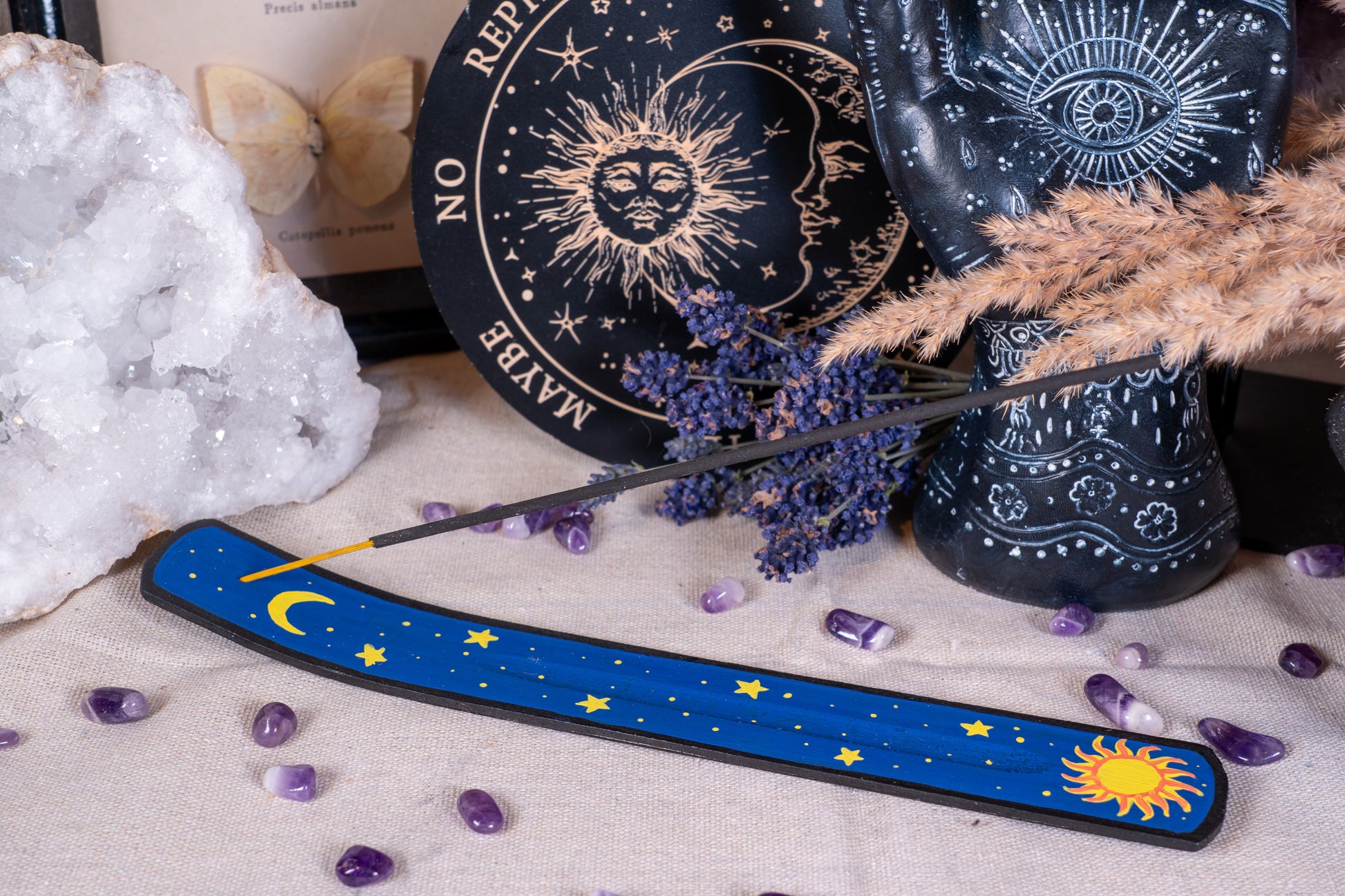 „Solara“ trägt die Energie der aufgehenden Sonne – warm, lebendig und lichtvoll. Die goldgelben Strahlen, von Hand mit Acrylfarbe aufgetragen, erinnern an Sonnenfeste, lichtdurchflutete Morgende und die Kraft des Neubeginns. Jeder Halter ist ein Einzelstück und bringt Leichtigkeit sowie strahlende Wärme in deine Rituale.