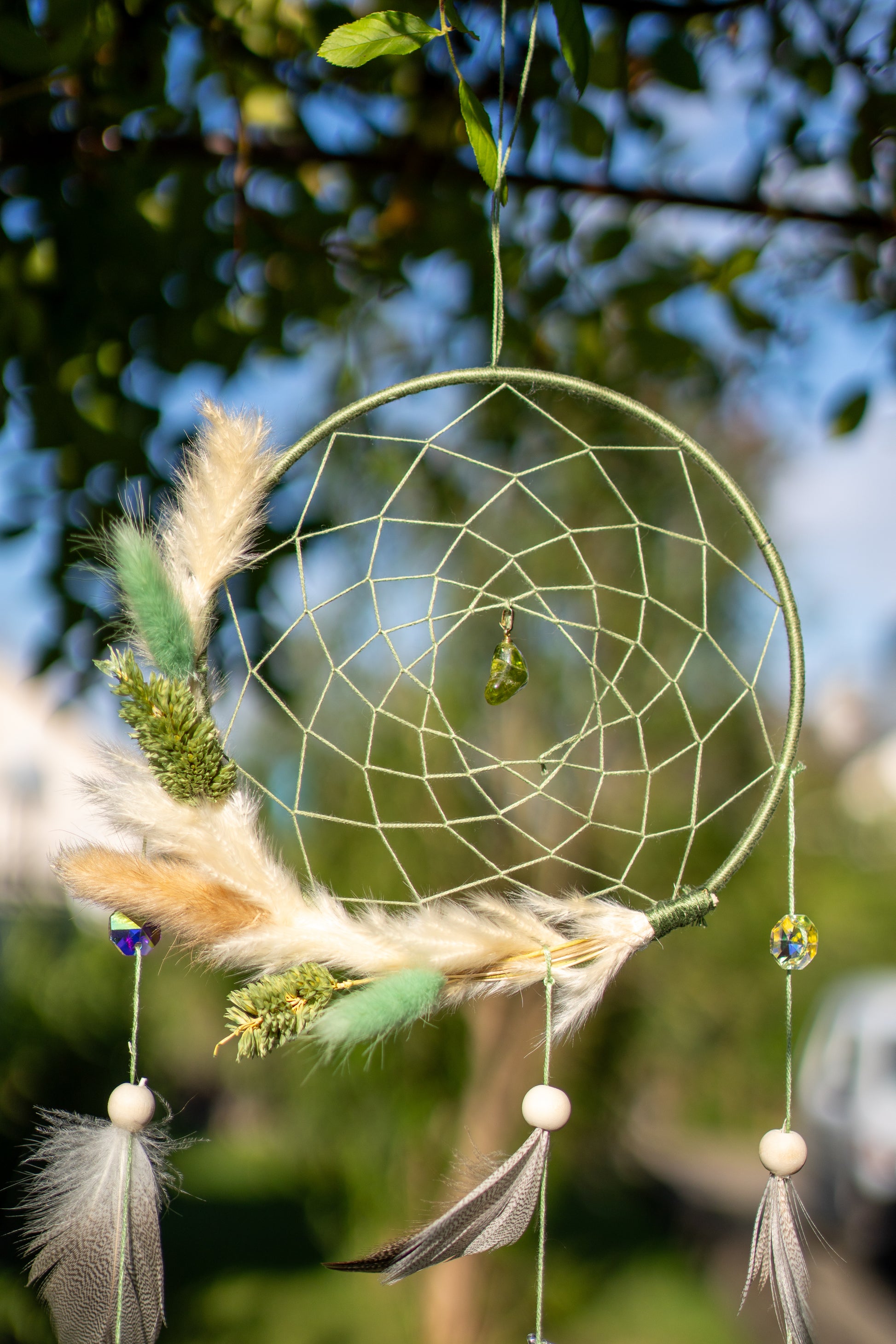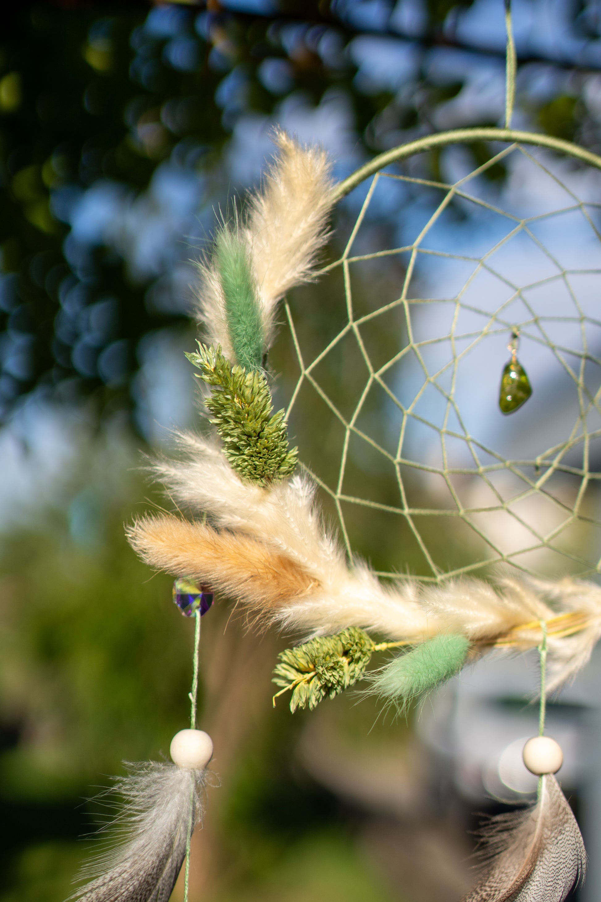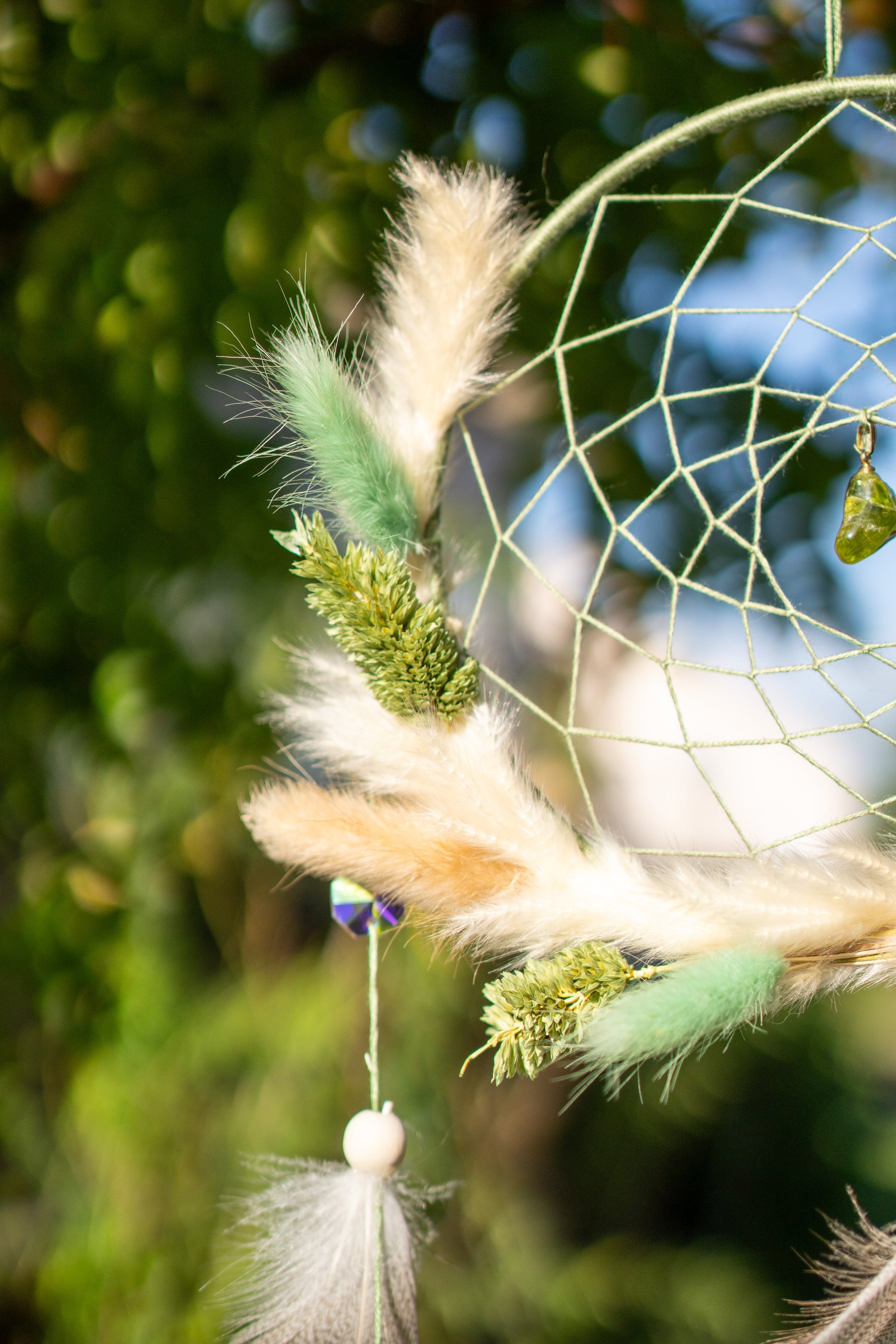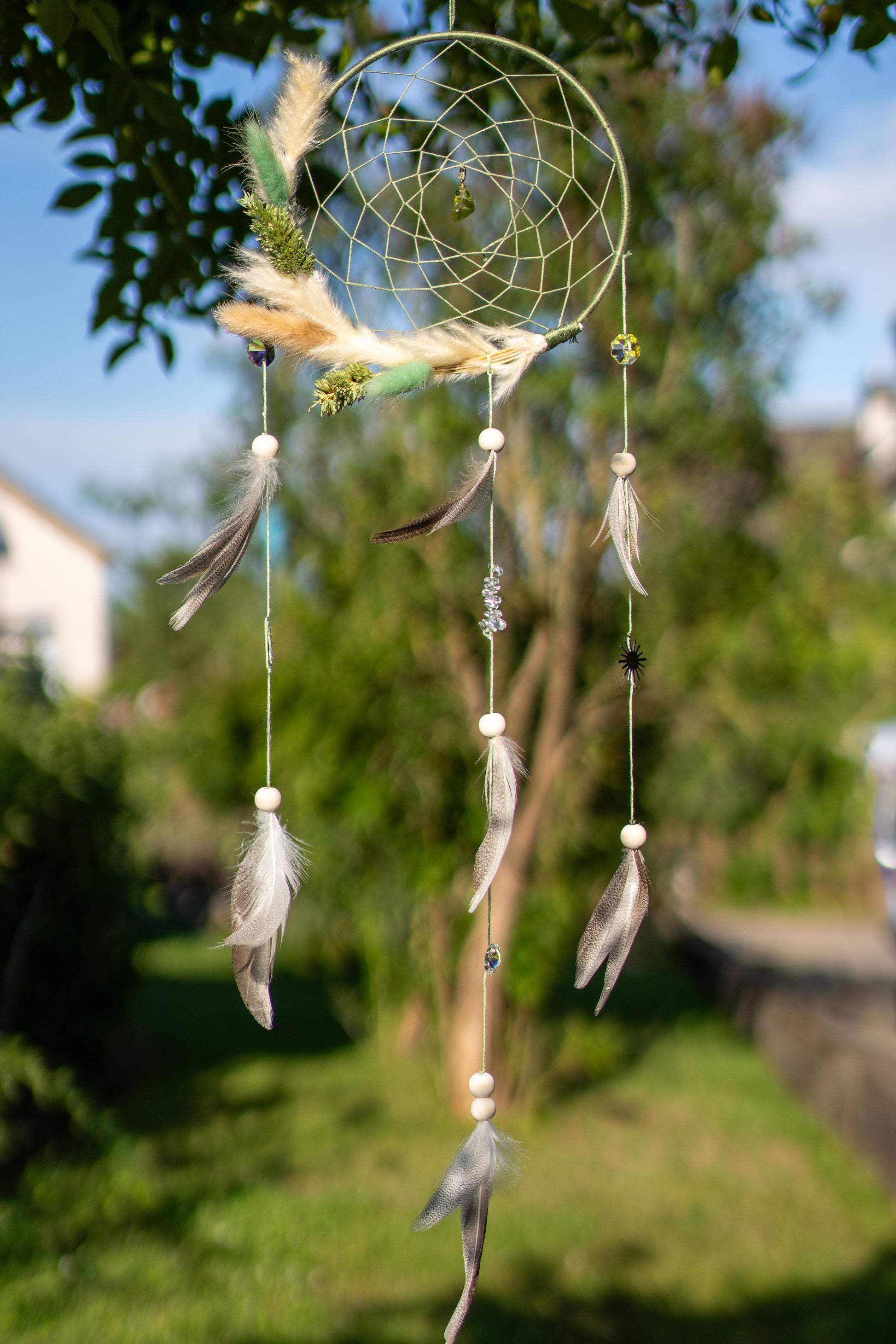 Verziert mit zarten echten Trockenblumen, in sanften Creme-, Grün- und Goldtönen, bringt dieser Traumfänger ein Stück Natur direkt in dein Zuhause. Die fein abgestimmten Federn schwingen leicht im Wind und sorgen für eine beruhigende, luftige Atmosphäre.