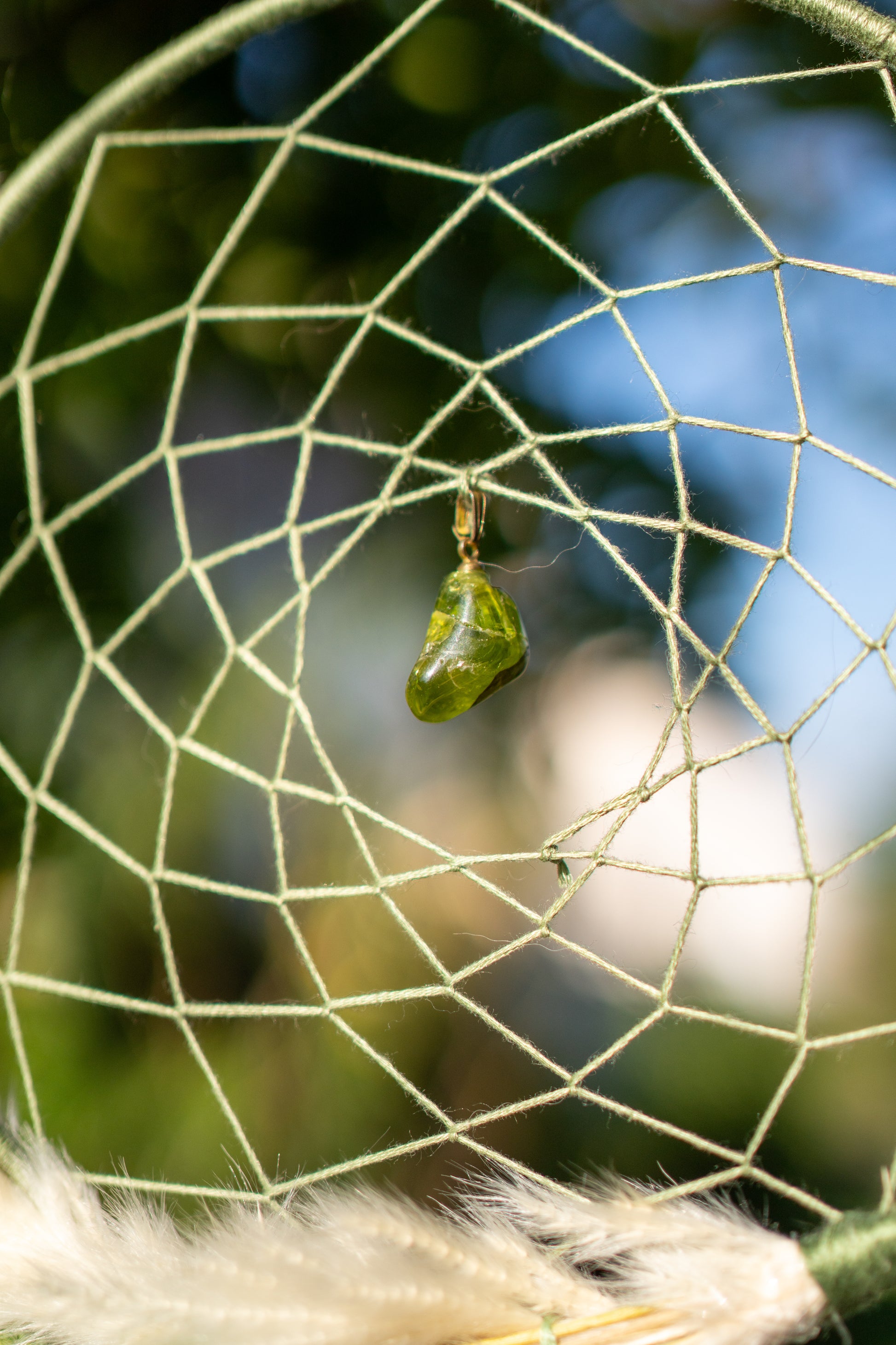 Im Zentrum des Netzes hängt ein roher Peridot – ein kraftvoller Heilstein, der für Neubeginn, Lebensfreude und inneres Wachstum steht. Er hilft dabei, alte Lasten loszulassen und Raum für frische Energie zu schaffen.