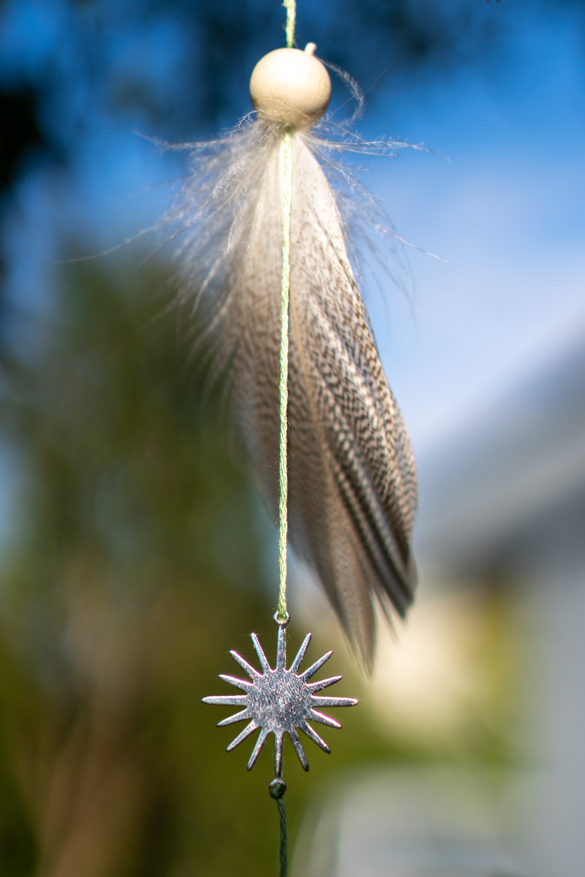 Zwischen den feinen Schnüren findest du glänzende Suncatcher-Kristalle, die bei Sonnenschein kleine Lichtpunkte in den Raum zaubern – ein Sinnbild für Klarheit und Hoffnung. Kleine Symbole wie eine filigrane Sonne sowie handverlesene Edelsteine und Perlen machen diesen Traumfänger zu etwas ganz Besonderem.