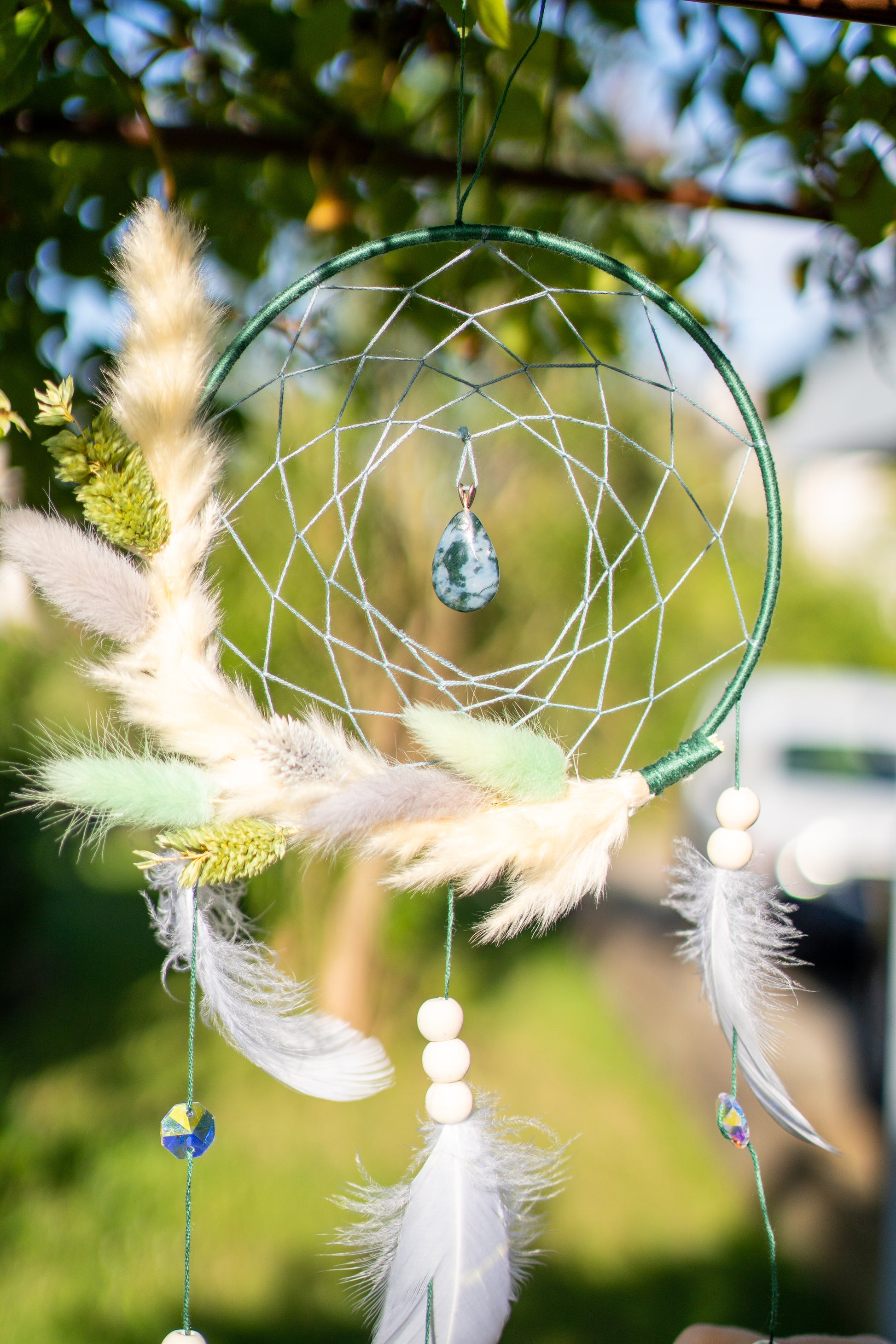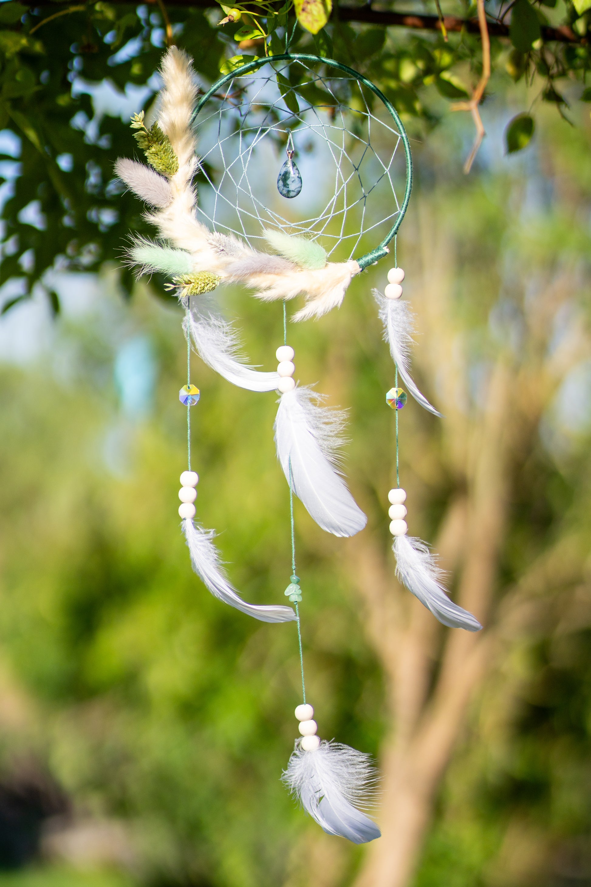 Materialien: Metallring, Baumwollgarn, echte Trockenblumen, Naturfedern, Moosachat, Glas- und Holzperlen, Suncatcher-Kristalle