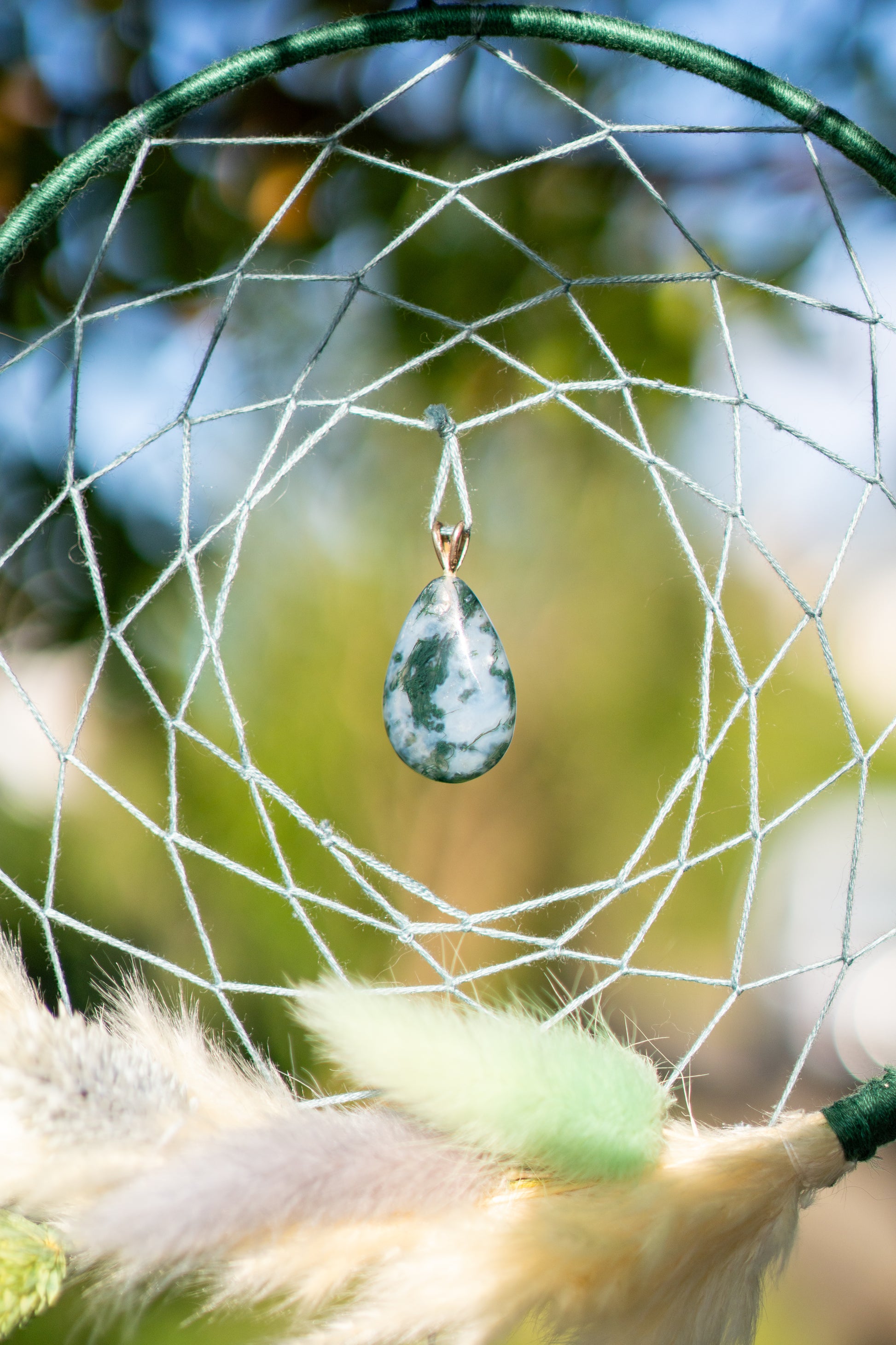 Der Tropfen aus echtem Moosachat im Herzen des Netzes steht für Erdung, Stabilität und die tiefe Verbindung zur Natur. Moosachat gilt als Stein der inneren Ruhe und unterstützt dabei, Vertrauen zu entwickeln und sanft im Hier und Jetzt anzukommen.