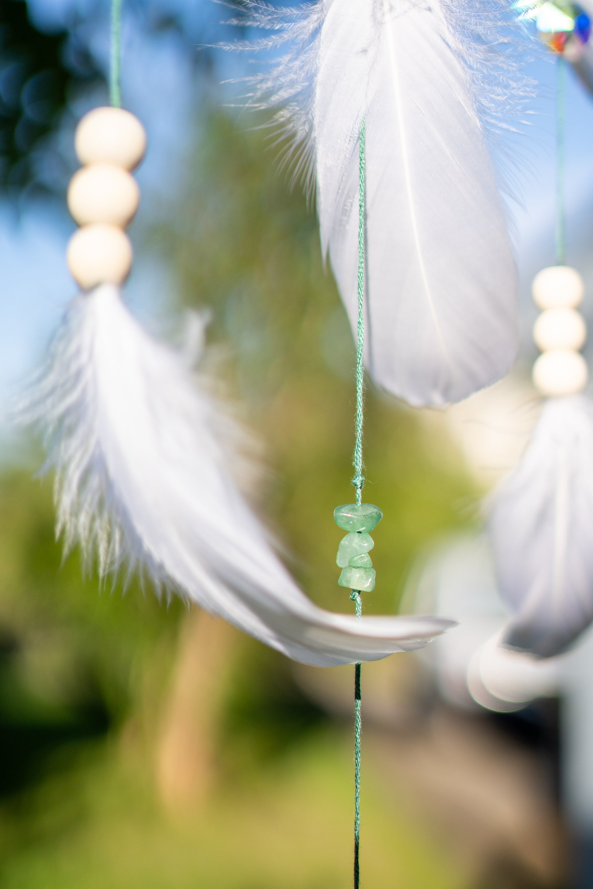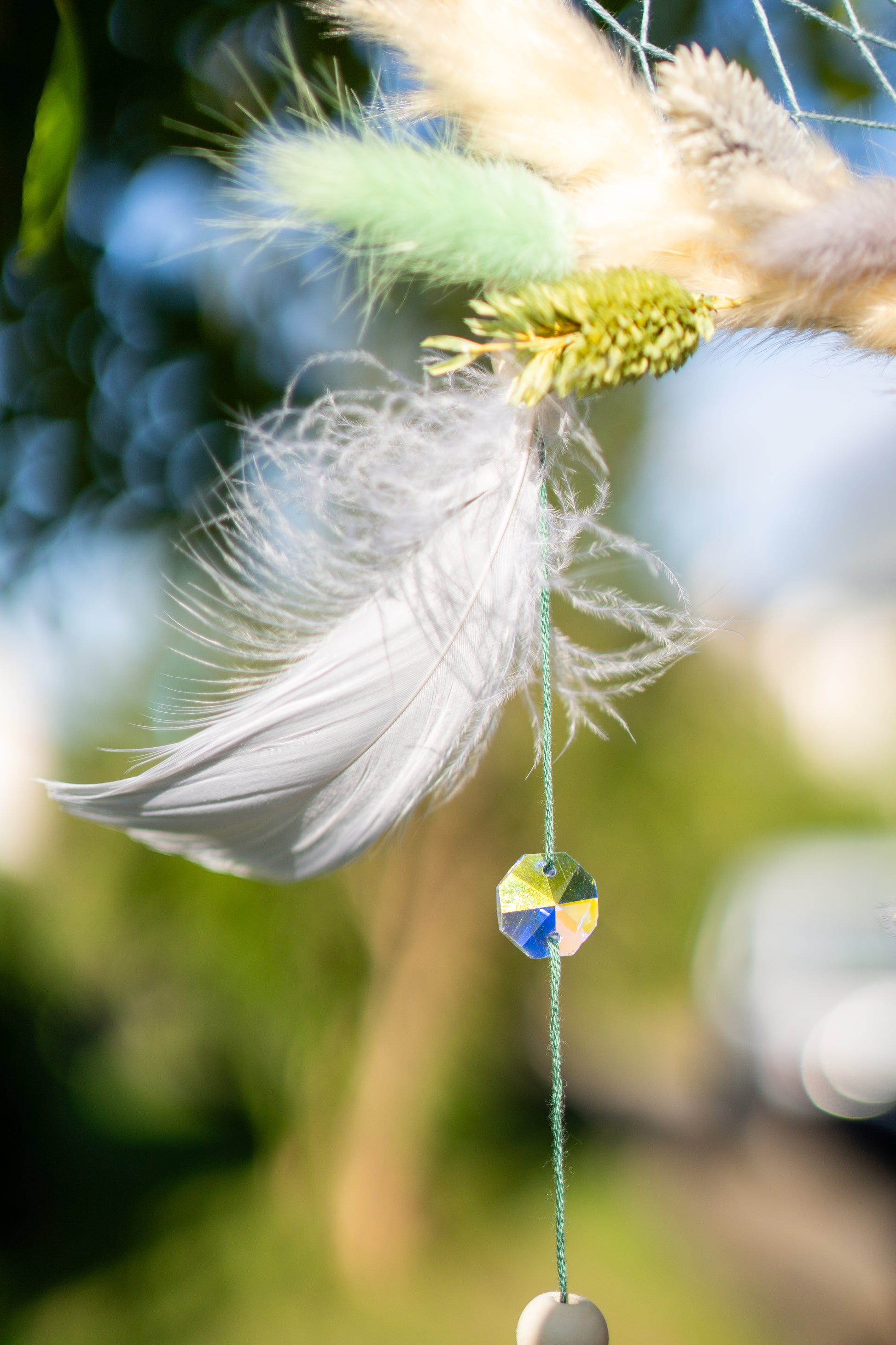 Zwischen den Schnüren tanzen funkelnde Suncatcher-Kristalle im Sonnenlicht. Sie fangen die Helligkeit ein und bringen Lichtreflexe in den Raum – ein Sinnbild für Klarheit, Hoffnung und Schutz. Kleine grüne Edelsteinchips und liebevoll gesetzte Details runden das Gesamtbild ab.