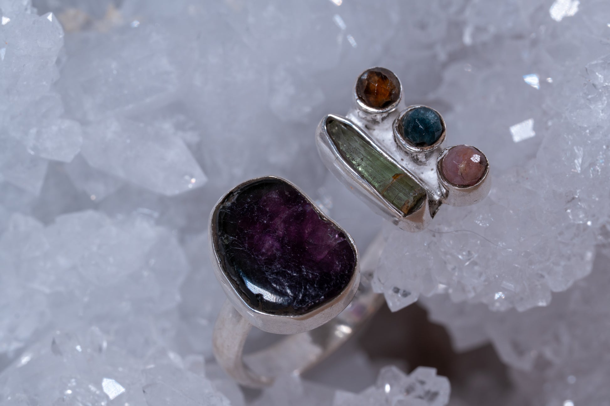 Ein verspielter, offener Ring mit verschiedenfarbigen Turmalinen – rosa, grün, gelb und grau. Jeder Stein steht für eine andere Facette des Lebens, zusammen bilden sie eine harmonische Komposition.